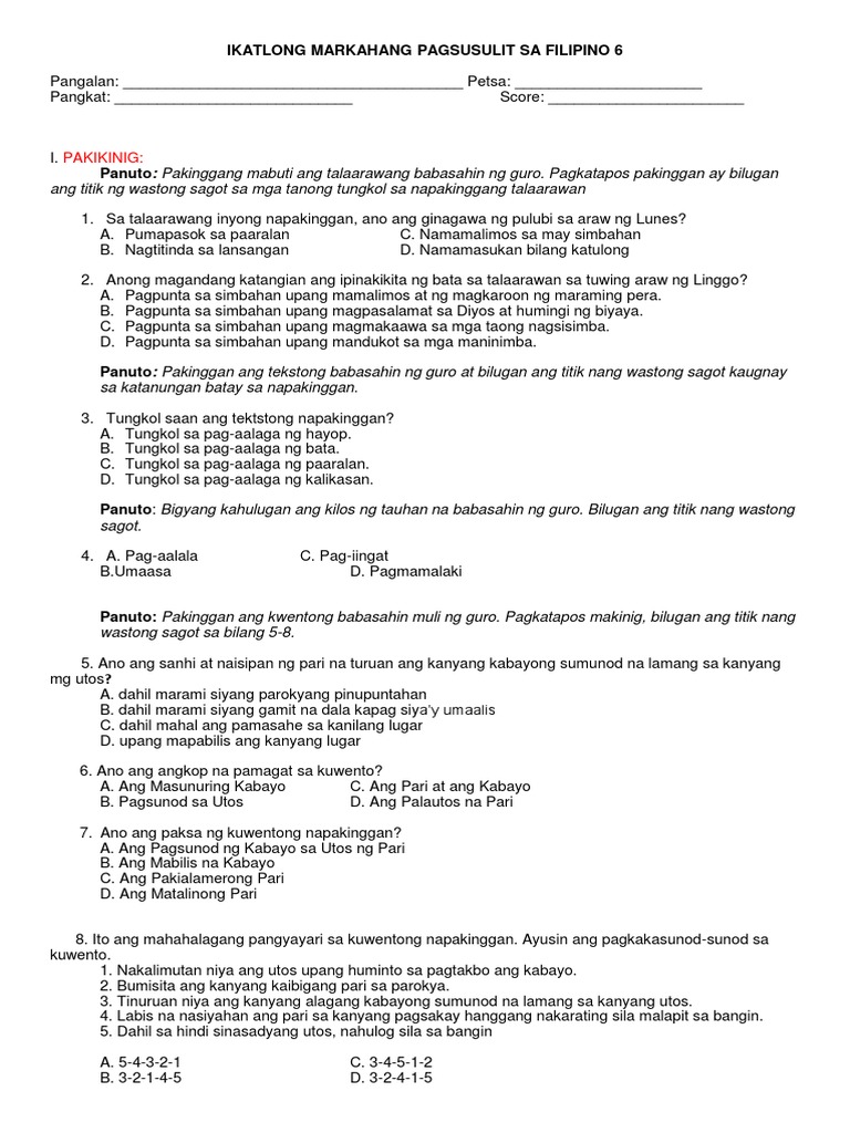 Ikatlong Markahang Pagsusulit Sa Filipino 6 Pdf
