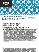 Mahalaga ang isang kultura sapagkat ito ang nagbibigay ng pagkakakilanlan ng bawat pangkat o grupo na kasapi sa isang komunidad o lipunan. KALAGAYAN NG WIKANG FILIPINO SA MAKABAGONG PANAHON _____ Isang Pagbabalak na Inihanay kay. Ito po ang mga topics na meron sa Komunikasyon at Pananaliksik sa Wika at Kulturang Pilipino.