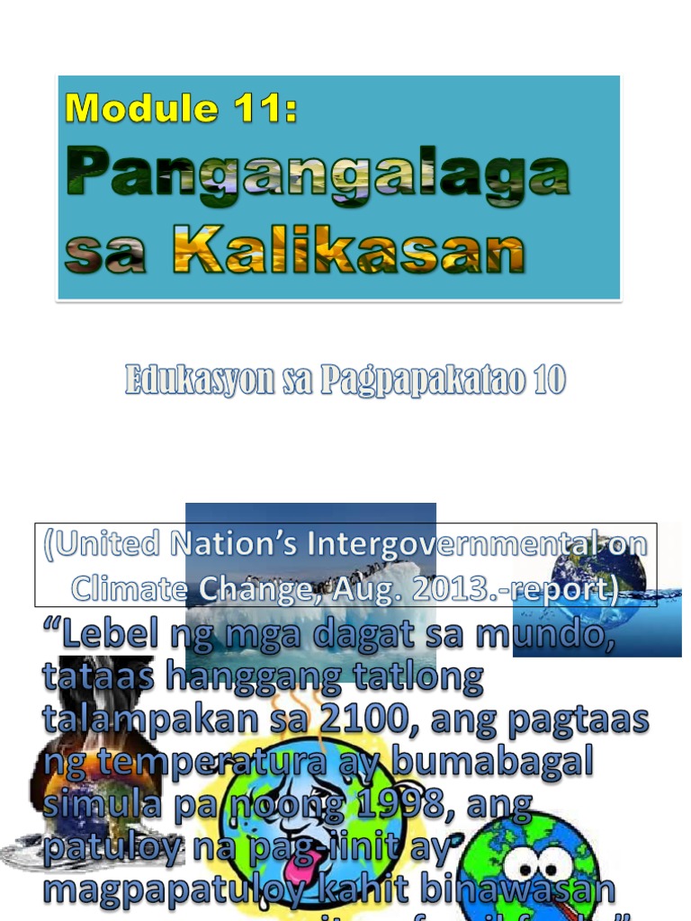 PANGANGALAGA SA KALIKASAN by Roberto Herradura MODYUL 11 Ayon sa aklat ni Genesis kabanata 1 talatang 27-31. Pangangalaga sa kalikasan F. Hingin ang susi sa pagwawasto sa iyong guro.